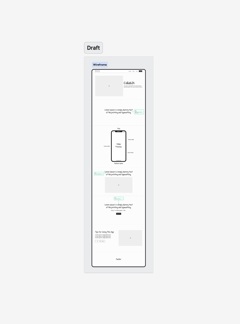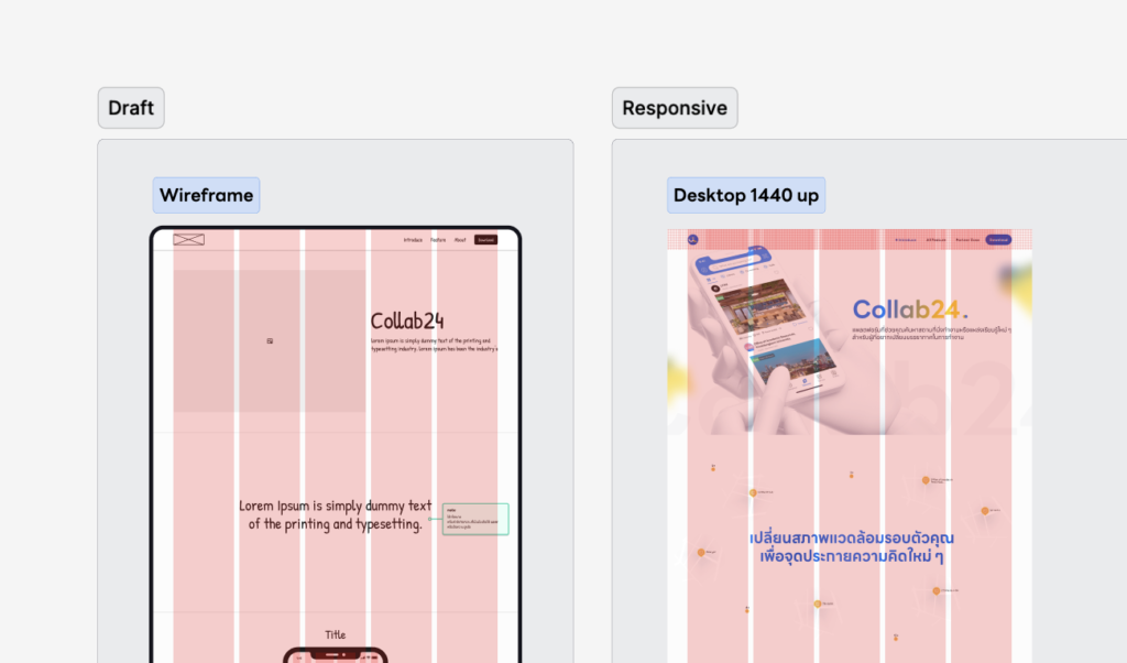 หลังจากได้ scope จาก sitemap ที่สรุปกับทีมแล้วคร่าว ๆ ก็ได้ทำการร่าง wireframe และวาง layout ต่าง ๆ เพื่อคิดข้อความหรือเนื้อหาที่จะนำมาแสดงในหน้าเว็บ รวมถึงภาพประกอบต่าง ๆ ในเว็บไซต์